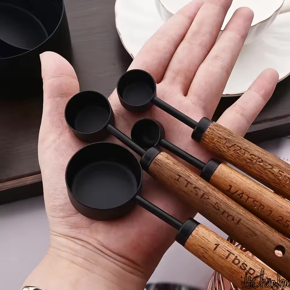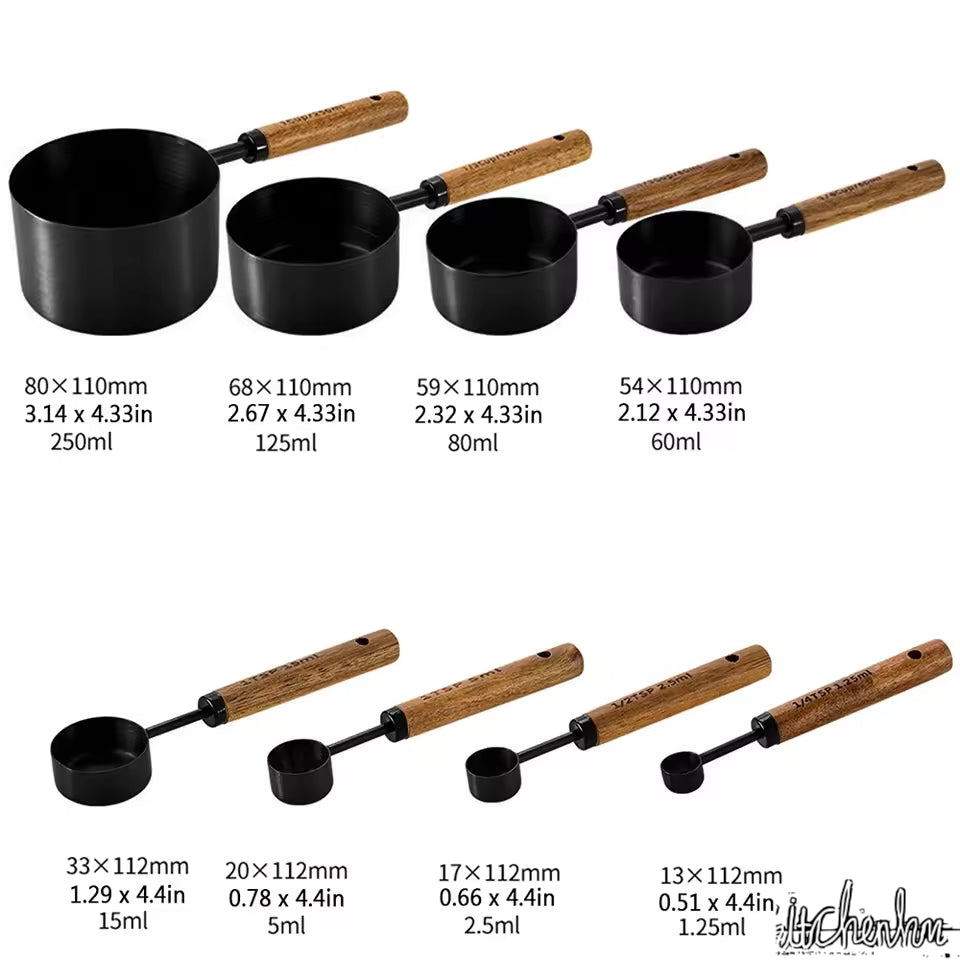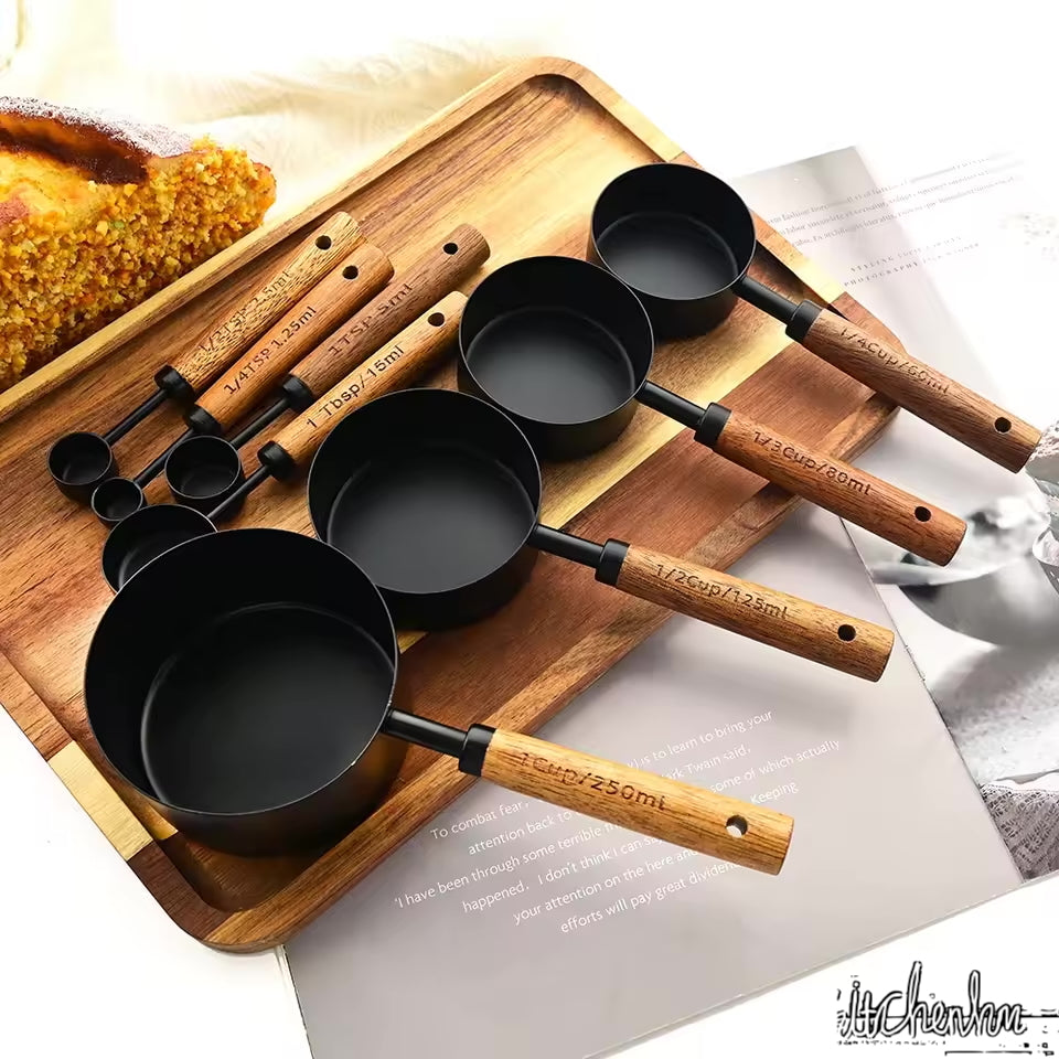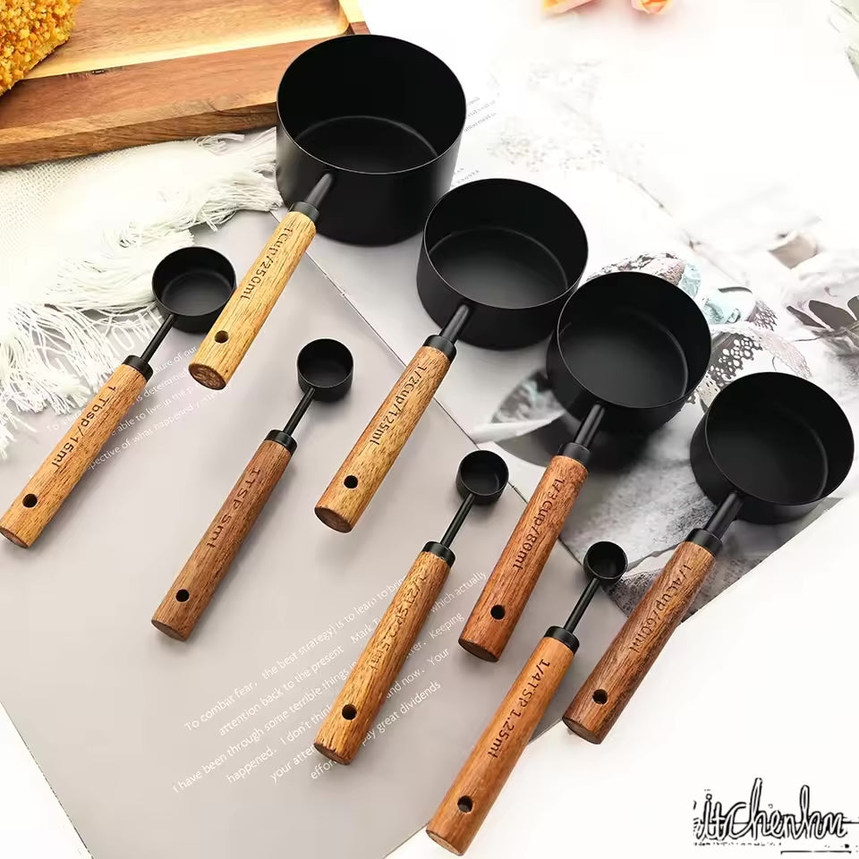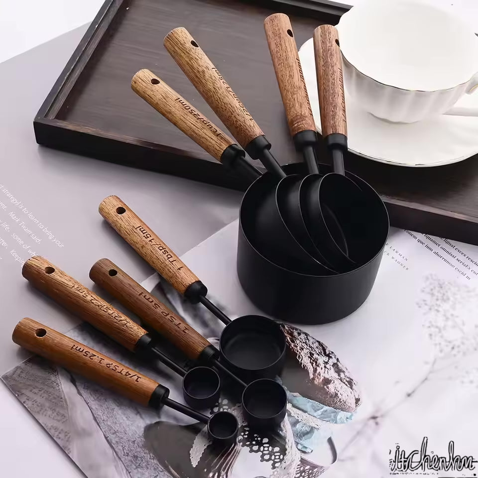 This stainless steel and wood measuring cup and spoon set combines style, functionality, and durability. Its elegant design, precise measurement capability, and space-saving storage make it a must-have for every kitchen.